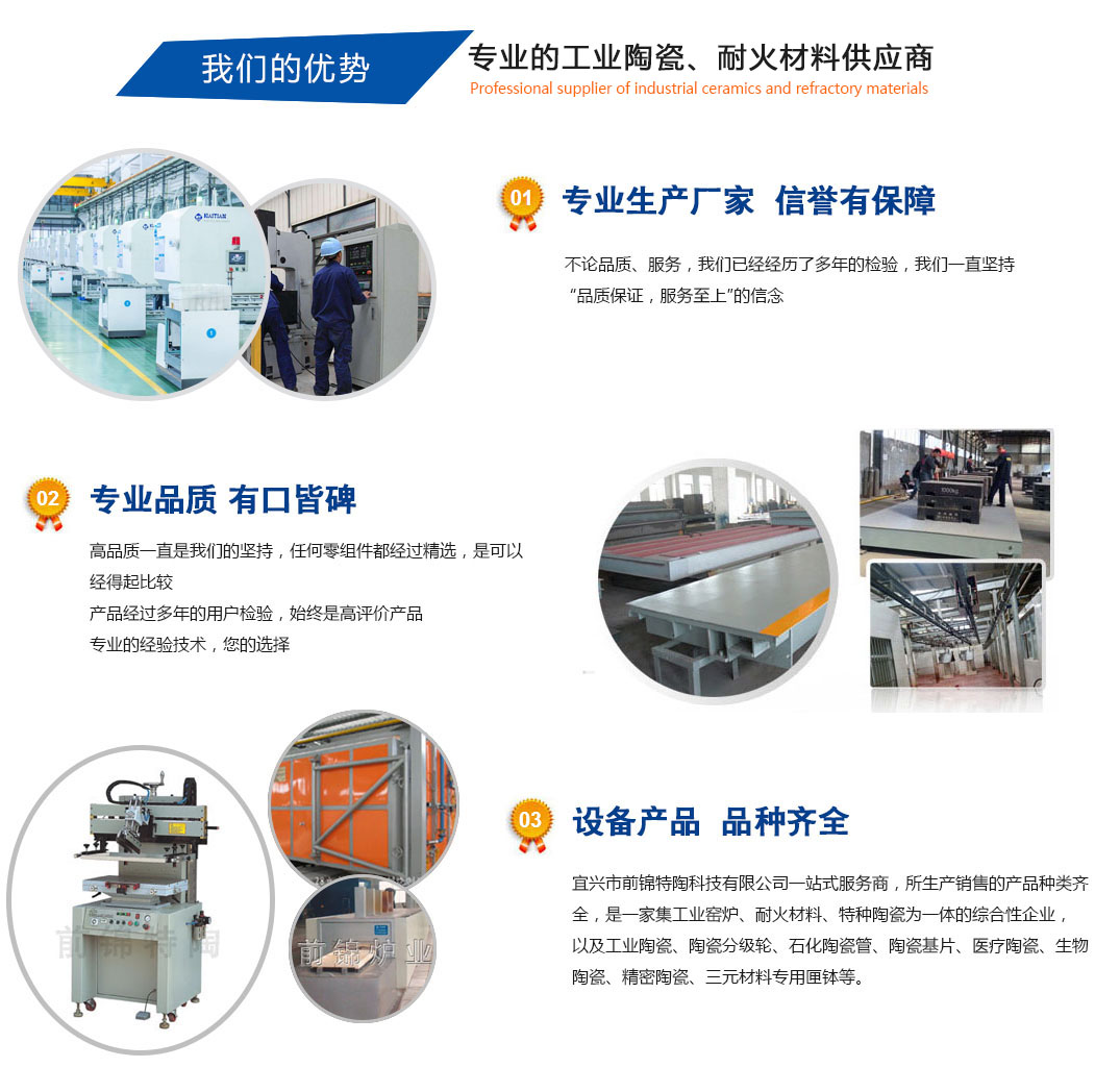 宜興市前錦特陶有限公司作為成員企業(yè)之一,公司主要生產工業(yè)陶瓷、窯具、匣缽、窯爐內襯系列。工業(yè)陶瓷以生產氧化鋯陶瓷、氧化鋁陶瓷、碳化硅陶瓷、氮化硅陶瓷等先進陶瓷為主;碳化硅制品有碳化硅異形件、三明治板、爐管等系列;耐火高溫窯具為剛玉爐管、剛玉莫來石制品、剛玉推板等產品;以及燒結墊板、氧化鋁空心球制品、sic板、石墨坩堝、堇青石復合莫來石板移進板、鋯粉、氮化硅陶瓷環(huán)、陶瓷棒、石化陶瓷管、陶瓷基片、磨介、分級輪和氮化硅球閥、熱電偶保護管、升液管等... ![]() |